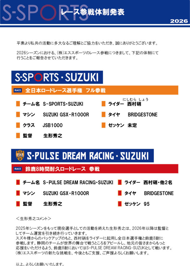 2026年シーズンにおけるチームのレース参戦体制を下記のとおり発表いたします。